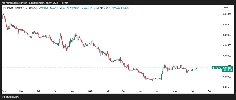 The ETH/BTC ratio tells a similar story. It fell from 0.05, the last cycle’s peak, to 0.015 in April. Since then, it climbed back to 0.024. That move suggests investors have rotated toward Ether. A break above 0.025 could mark a shift in relative strength.
