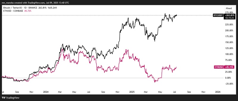 Ethereum has lagged through this cycle. Bitcoin notched new highs multiple times, most recently around $112,000 in May. Ether has failed to break its previous peak. Institutional flows and demand have yet to push prices past that ceiling.