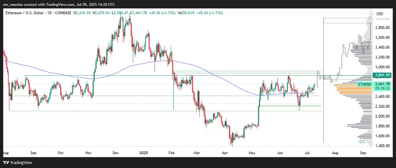 The volume profile to the right shows heavily traded prices clustering near $2,800. If Ethereum can break above that point and clear $2,840, this level will turn into a major support, where fresh supply waits. However, a drop below the 200-EMA could lead the price to retest $2,400. A break below this level would shift momentum negative and risk a slide toward the April low near $1,500.