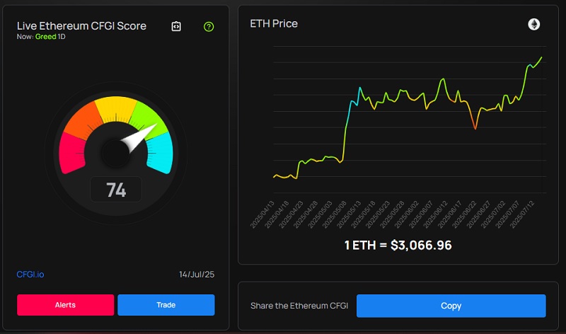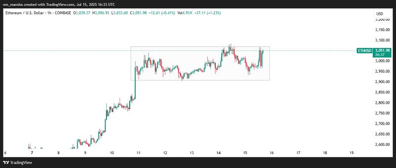 On July 15, Ethereum is trading inside a clear consolidation box between $2,950 and $3,100. After a sharp rise from $2,600 on July 7, the price seems to have stopped under the upper boundary of that range. Ethereum price repeatedly tested the resistance of $3,100, however, it could not break above that zone. The ETH price is also holding strong support. That pattern reflects a tug‑of‑war between bulls and bears.
