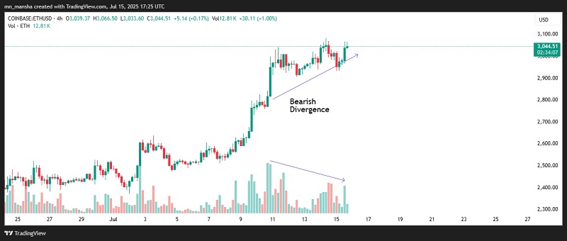 A closer look at the four-hour chart reveals a classic bearish divergence. Volume peaked at the beginning of the rally and then fell even as Ether made higher highs. This mismatch signals a weakening bullish trend among buyers. In effect, each higher swing carried less fuel. Consequently, the market now faces a decision point: a surge in demand will require a clear breakout above $3,100. However, if the price falls below the support at $2,950 could trigger a drop back toward $2,900 or lower.