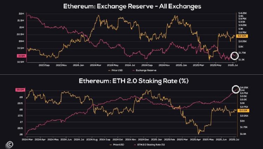 Not just that, Exchange reserves dropped to 18.59 million ETH, the lowest level ever recorded, while staked ETH soared to 29.91 million ETH, its highest level on record. Each data point points in one direction: a classic supply squeeze. Less ETH on exchanges should mean less sell-side pressure. More ETH locked in staking shrinks the liquid supply and increases price stability.