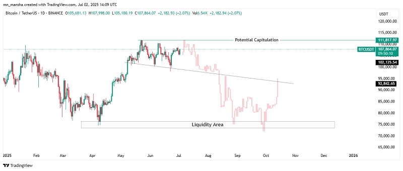The so-called “liquidity zone” around $75 k–$80 k lies far below current levels. Yes, price could drift toward that band if panic grips traders, but such a move would require a decisive break below the 200-day EMA (~94k). History shows Bitcoin rarely dives straight through multiple long-term averages without pausing or rebounding first.