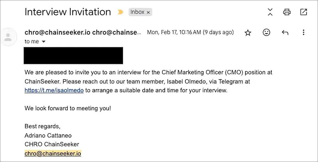 The scam involved the creation of an elaborate online presence, including a fabricated company named “ChainSeeker.io.” The perpetrators established a website and multiple social media profiles on platforms such as LinkedIn and X to lend credibility to their deception. To attract job seekers, the attackers posted premium job listings on reputable job platforms like LinkedIn, WellFound, and CryptoJobsList, which are commonly used for Web3 and blockchain-related career opportunities.