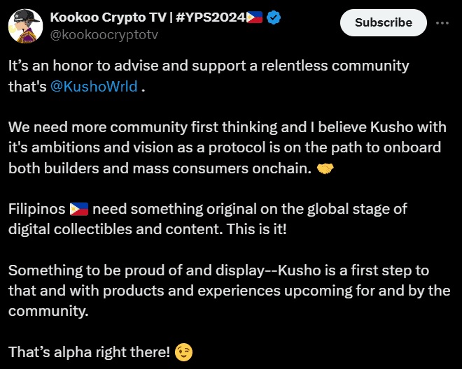 Further solidifying its commitment to the community, Kusho World announced on September 24, 2024, that Kookoo CryptoTV, a prominent Web3 content creator, has joined the company as an official advisor and contributor. This partnership is seen as a strategic move, with Kookoo CryptoTV voicing his support for Kusho World’s vision of onboarding both creators and consumers into the Web3 ecosystem. He praised Kusho’s focus on community-driven initiatives and its potential to offer Filipinos a unique presence on the global stage of digital content and collectibles.