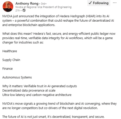 The announcement, shared through a professional networking platform by Anthony Rong, Nvidia’s Regional Vice President of Engineering, underlined the transformative potential of this collaboration. According to him, the integration of Hedera’s public ledger with Nvidia’s AI tools is expected to redefine how industries approach data trust, integrity, and validation in AI-generated processes.