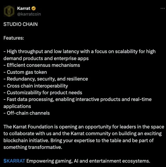 The KARRAT Foundation envisions Studio Chain as a native chain within its ecosystem, optimized for the specific requirements of the products it supports. According to the team, this tailored chain would offer levels of customization and performance that general-purpose blockchains cannot consistently provide.