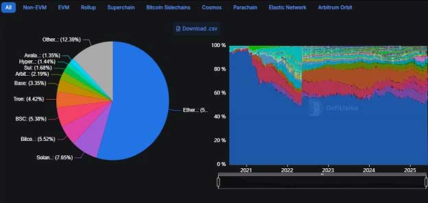 According to Defillama, the DEX scanner, in the last 30 days, the trading volume of the Solana blockchain on DEXs was $90.21 billion, followed by $66.81 on the Ethereum blockchain. The on-chain data shows that over 54% of the total Value Locked (TVL) is on the Ethereum ecosystem, while the Solana ecosystem shares only 7.65% of the total.